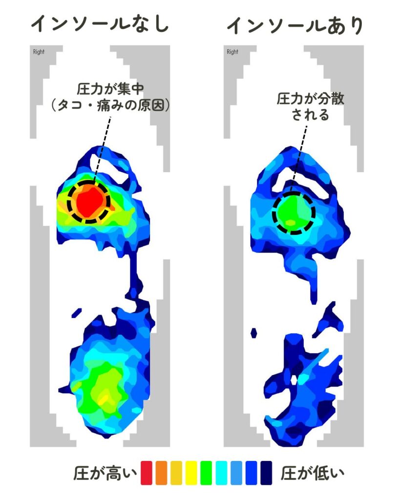 インソールで足裏にかかる圧力を分散し、タコ・痛みなどのトラブルを軽減する効果があります。