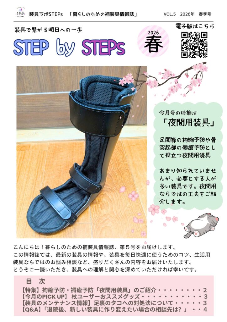 この情報誌では、最新の装具の情報や、装具を毎日快適に使うためのコツ、生活の中で使う装具ならではのお悩み相談など、一般の方にも読みやすい内容を掲載しています。