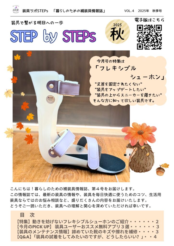 「STEP by STEPs」は暮らしのための補装具情報誌です。季節ごと年に4回発行しています。