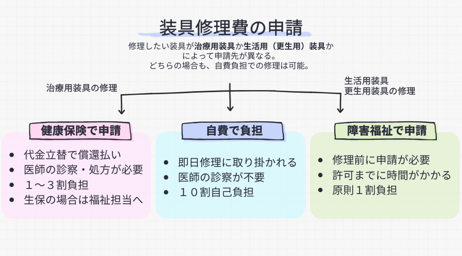 装具修理の流れは、修理費をどこに申請するか、申請せずに自費負担で行うかによって異なります。