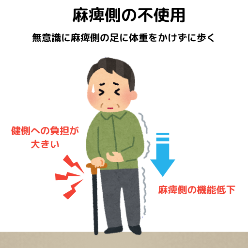 本来は左右で分け合って支えるものを片側で支えることになるので、当然健側の負担は増える。 - 麻痺側の機能低下